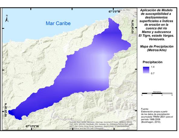 El factor k (peso litológico) se asigna de acuerdo a la litología local (ver cuadro 3), para el caso de los índices de erosión se tomó la precipitación acumulada para 12 años registrada en Bookhagen (Bookhagen, 2010), mostrada en la figura 3.