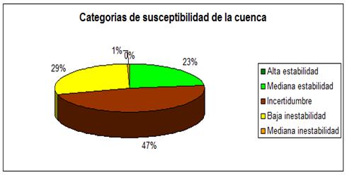 A diferencia de los cálculos de susceptibilidad para toda el área de estudio, la subcuenca El Tigre tiende a ser inestable, ya que aproximadamente el 80 % de la misma presenta una “Media y Baja Inestabilidad”.