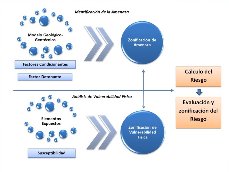 Para la identificación y evaluación de la amenaza por deslizamientos, se adoptó el método propuesto por Mora-Varhson-Mora (1992), con variaciones a partir de los trabajos realizados por Valleé (2006) y Sánchez y Urego (2011). En cuanto al análisis de la vulnerabilidad física y elementos expuestos, se adoptó la metodología propuesta por Padrón (2015), con ajustes de la base de datos suministrada por el Instituto Municipal de Gestión de Riesgos y Administración de Desastres (IMGRAD) de las viviendas evaluadas y espacializadas durante el año 2013. En la figura 2, se presenta un esquema general para la evaluación del riesgo de desastres aplicado en la investigación.