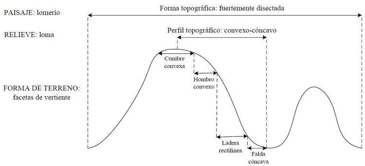Las distintas geoformas descritas para la zona de estudio se agruparon en 3 categorías, según los atributos del perfil topográfico (Zinck, 2012), esto facilitó el análisis de la topografía mediante la sección transversal de una porción de terreno, logrando visualizar en dos dimensiones la geometría de las geoformas. Las geoformas antes mencionadas, se agrupan en perfiles de topografía cóncavos, convexos y rectilíneos, información que fue necesaria para elaborar y diseñar el mapa de relieve o geoformas (figura 3).