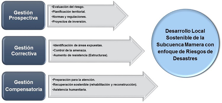 A propósito de la gestión prospectiva, se analizaron las condiciones generadoras del riesgo de desastre por deslizamientos, además de las políticas de ordenación del territorio y los planes de inversión local. Asimismo, en la gestión correctiva, se definieron acciones para el control de la amenaza por deslizamientos, medidas para aumentar la resistencia de las edificaciones ante las solicitaciones impuestas al ocurrir estos eventos, como también, acciones para la recuperación ambiental. Por último, en la gestión compensatoria, se definieron acciones cuyo propósito es apoyar la recuperación integral de la población afectada a partir del aprovechamiento de sus recursos propios, propiciando el fortalecimiento comunitario e institucional con miras de generar capacidades de recuperación psicosocial de la población, medios de subsistencia y la recuperación económica local.