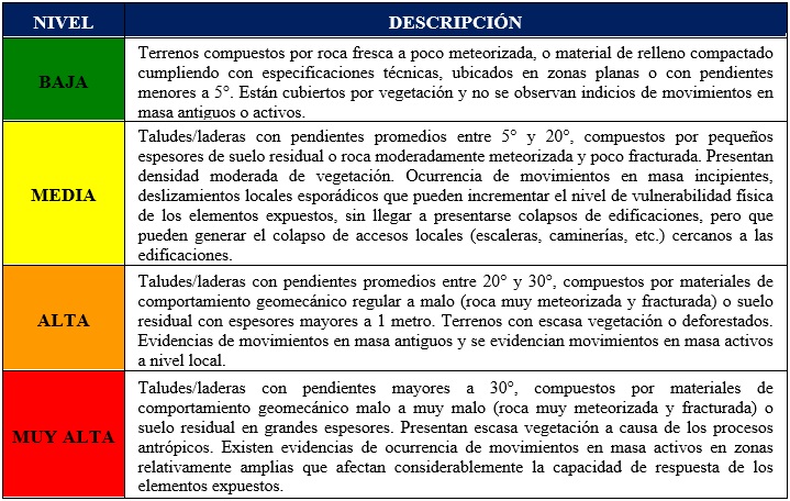La correlación de las variables utilizadas para determinar la susceptibilidad y la amenaza por deslizamientos, así como también, el análisis de los distintos factores correspondientes a la vulnerabilidad física, sirvieron para diseñar la siguiente tabla síntesis, dividida en cuatro (4) clases o niveles de riesgo de desastres por deslizamientos (tabla 14).