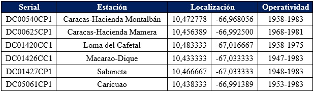 Con los datos de lluvia suministrados por el Instituto Nacional de Meteorología e Hidrología (INAMEH) se analizaron específicamente los registros de 6 estaciones pluviométricas, ubicadas en las adyacencias de la subcuenca Mamera (tabla 10).