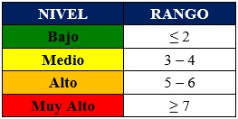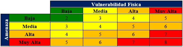 Los valores numéricos asociados a cada nivel, obtenidos en el cálculo aritmético de la amenaza y vulnerabilidad física, respectivamente, se sustituyeron por valores enteros entre 1 y 4, siendo la relación: 1 (verde), 2 (amarillo), 3 (naranja) y 4 (rojo).