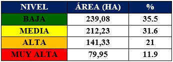 Pareciera contradictorio que el territorio estudiado, por encontrarse en una zona de montaña con laderas inestables, destacan los niveles de susceptibilidad Baja y Media, donde ambos niveles suman el 67% del total del área estudiada. Esto es reflejo de que la mayoría de los espacios antes mencionados no tienen influencia de los factores antrópicos; en muchos casos corresponden a las áreas rurales dentro de la subcuenca Mamera.