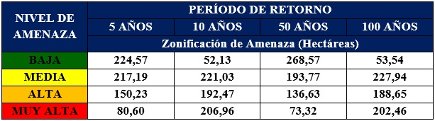 Los niveles de amenaza Media y Alta se observan que mantienen poca variabilidad en los distintos períodos de retorno, manteniendo los rangos porcentuales de área entre 28,8% y 33,8% para el nivel de amenaza Media, y una variación entre 20,3% a 28,6 % para el caso de la amenaza Alta.