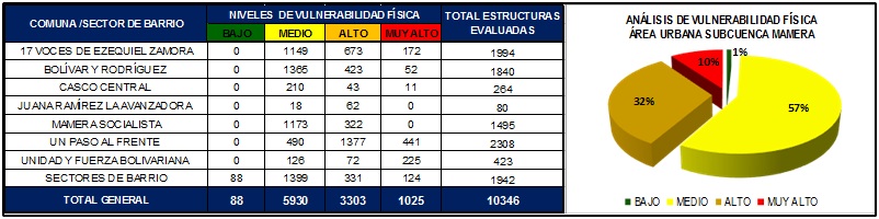 El análisis de la vulnerabilidad física se realizó en el área urbanizada que alcanza una superficie total de 287,09 hectáreas. Se evaluaron un total de 11.465 estructuras, de los cuales, 10.346 son edificaciones de uso residencial. Los resultados arrojan, de acuerdo al modelo aplicado, un total de 88 estructuras con nivel Bajo de vulnerabilidad física, 5.930 en nivel Medio, 3.303 en Alto y 1.025 Muy Alta vulnerabilidad física (tabla 17). Respecto a la información social, en el área urbana de la subcuenca Mamera, se estiman alrededor de 11.375 familias, para un total aproximado de 44.685 personas.