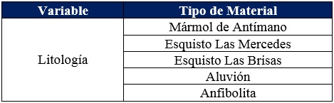 Esta variable se utilizó para evaluar la influencia de los diferentes tipos de materiales, suelo y roca, en la activación de los deslizamientos. Para el caso de estudio, de acuerdo a la geología regional y local, se establecieron cinco (5) categorías (tabla 1), siguiendo el criterio de jerarquías analíticas en atención a las características geotécnicas de las unidades litológicas (Feliciani et al., 1985).
