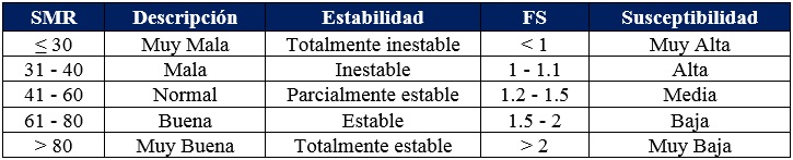 Para el análisis cinemático y de estabilidad se definieron cinco (5) categorías (rangos de SMR), a partir de los trabajos realizados por Hernández et al. (2008) y Minminas (2015), que sirvieron a los efectos de la presente investigación como una condición parcial de la susceptibilidad a deslizamientos. En la tabla 3 se muestra una aproximación de la susceptibilidad a deslizamientos, donde el valor del SRM es un marcador para rocas y, con base en el factor de seguridad, la condición de inestabilidad en suelos. Los valores de SMR obtenidos en cada estación de trabajo se utilizaron para la elaboración de la cartografía temática, mediante el procedimiento IDW (Inverse Distance Weighting) del ArcGIS 10.1.