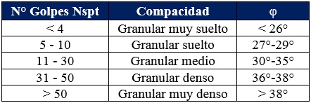 En este punto, a partir de los sondeos geotécnicos realizados en la zona de estudio por Azancot (2014), se efectuó una zonificación geotécnica considerando que los materiales predominantes se comportan como suelos granulares en toda el área de la subcuenca Mamera, para estimar entonces el ángulo de fricción y la compacidad de los materiales (tabla 4). Dado que los resultados del trabajo realizado por Azancot (2014) no presentan información concerniente al ángulo de fricción en ninguno de los puntos de sondeo, se estimó la compacidad del material a partir del número de golpes Nspt en los niveles de suelo, según la tabla de compacidad propuesta por De Santis (s/f).