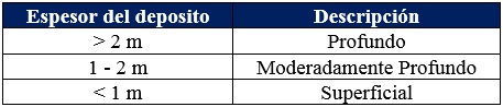 Para efectos de la investigación, se asumió la clasificación propuesta por Van Zuidan (1985), quien define 5 categorías para diferenciar los espesores de los depósitos. Sin embargo, a la clasificación de Van Zuidan (1985) se le realizaron algunos ajustes en tres (3) de las categorías de los espesores de suelo, ya que no se contó con información detallada de los depósitos en rangos menores a 1 metro (tabla 5).