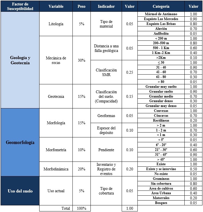 La ecuación mostrada anteriormente (ecuación 1), supone que la zonificación de la susceptibilidad por deslizamientos se fundamenta en tres factores condicionantes básicamente: las condiciones geológico-estructurales, la geomorfología y el uso del suelo. Cada uno de los factores mencionados, tiene asociado un conjunto de variables e indicadores, establecidos a partir del modelo de Sánchez y Urego (2011).