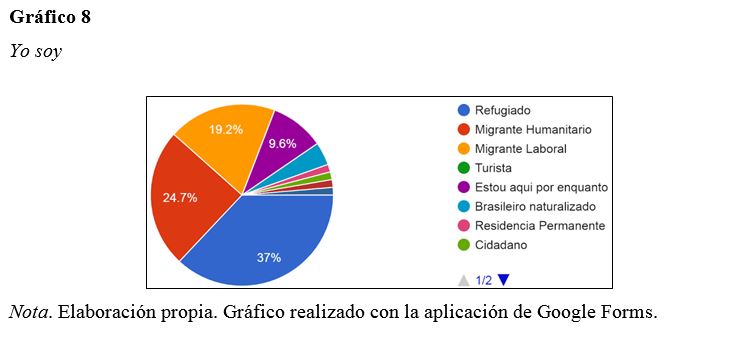 Este ítem, planteado de manera subjetiva, tuvo como finalidad ver de qué manera se ven los venezolanos en el proceso migratorio actual. 27 personas se identifican como refugiados, 18 personas se denominan migrantes humanitarios, 14 venezolanos se identifican como migrantes laborales. Destacan 7 personas que dicen estar aquí temporalmente, no identificándose como migrantes, 3 personas se identifican como brasileños naturalizados, sea porque tienen padres nativos o porque ya no se sienten más venezolanos.