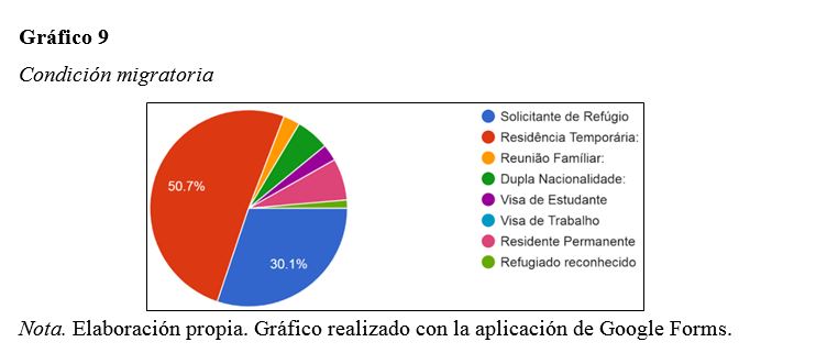 Se les preguntó a los encuestados ¿cuáles documentos migratorios poseen?, obteniéndose los siguientes resultados: 37 personas respondieron tener como documento de identificación migratoria la residencia temporaria, lo que corresponde al 50,7% de los encuestados. Estas personas, al menos 13 declaran que anteriormente eran solicitantes de refugio, pero que como no tenían un documento de identidad con foto y por otras razones, decidieron cambiar de documento. Por otra parte, 22 personas declaran poseer la solicitud de refugio (protocolo) y denunciaron que algunas instituciones públicas o privadas no aceptan dicho documento para conseguir trabajo o para abrir cuentas bancarias. Otros 5 son residentes permanentes por tener hijos brasileños, 4 poseen la doble nacionalidad por tener padres y/o conyugues brasileños, 2 con visa de estudiantes y 1 persona declara tener documento de refugiado internacional reconocido. Así mismo, los migrantes expresan que es difícil abordar a la Policía Federal (PF) porque no hay claridad de las necesidades burocráticas y la comunicación es complicada debido a la barrera del idioma. Según los migrantes, el tratamiento de la PF no es coherente con la calidad de sus profesionales.