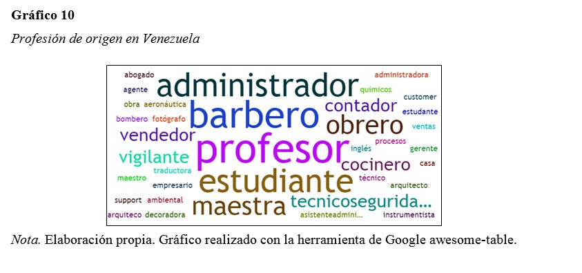 En este apartado se realizaron 4 preguntas referentes a la situación laboral de los migrantes. En primer lugar, se preguntó ¿cuál era su profesión u ocupación en Venezuela?