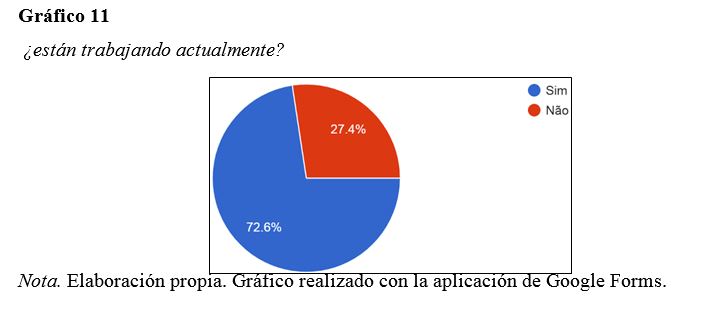 También se preguntó si ¿están trabajando actualmente?, de los cuales 53 venezolanos respondieron que sí, frente a 20 que no están realizando actividades laborales, tal y como lo muestra el gráfico 11. Para complementar, se preguntó que si la actividad laboral realizada coincidía con la experiencia laboral del país de origen, de los cuales 34 personas respondieron de manera negativa, es decir, se encuentran realizando labores diferentes a su experiencia laboral y profesional en Venezuela.