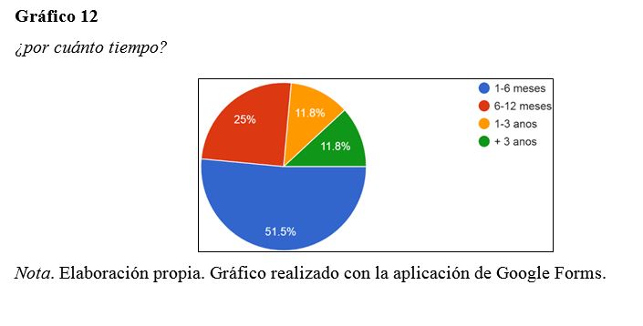 Entonces, puede percibirse que no se conoce el potencial de riqueza cultural y productiva que puedan aportar los migrantes venezolanos al mercado laboral curitibano ya que los migrantes son vistos como una amenaza para el trabajo. Así mismo, de las 53 personas que están trabajando, 26 manifiestan tener menos de 6 meses trabajando, 14 venezolanos tienen entre 6 a 12 meses trabajando y 5 personas tienen una antigüedad entre 1-3 años y más de 3 años respectivamente, conforme se muestra en el gráfico 12.