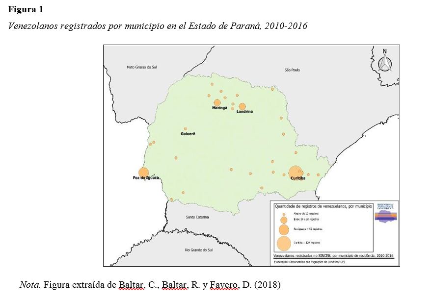 Baltar et. al (2018) explica que “entre 2010 y 2016 según los datos del Sistema Nacional e Cadastramento e Registro de Estrangeiros da Polícia Federal (SINCRE-PF), para el año 2016, el estado de Paraná concentra 285 migrantes venezolanos” (p.289), de los cuales Curitiba, es el municipio con la mayor concentración de venezolanos, con 129 registros, seguido de Foz de Iguaçu, municipio fronterizo en la región occidental del estado, con 52 registros de venezolanos. También destacan Londrina y Maringá, en el norte central, que registraron entre 10 y 20 registros de entrada venezolanos. Todo esto se refleja en la figura a continuación: