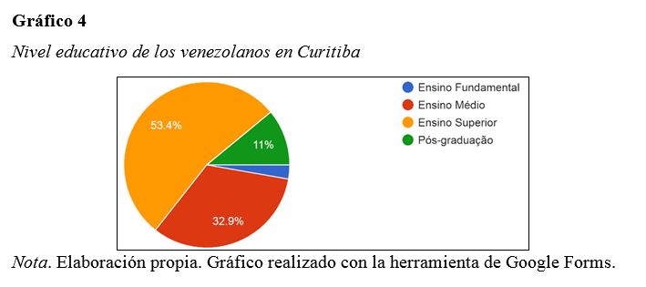 De acuerdo con las 73 respuestas se tiene que más del 50% de los entrevistados (39 personas) tienen estudios universitarios culminados, además, 8 personas tienen estudios de posgrado culminados. Lo que indica que la migración venezolana en Curitiba está compuesta por profesionales. Otras 24 personas que tienen tan solo educación básica culminada y/o educación superior incompleta, respondieron tener interés en continuar sus actividades académicas en el país. Así mismo se preguntó si la persona tiene en su poder los documentos que comprueban su escolaridad, a lo cual 50 personas respondieron que sí, pero de las cuales un 80% (40 venezolanos) aún no ha logrado revalidar u homologar sus documentos frente al Ministerio de Educación brasileño. En este sentido, varios migrantes declaran que existen problemas burocráticos tanto para la revalidación del diploma como para el ejercicio de la profesión.