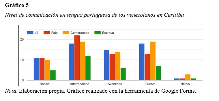 De acuerdo con las respuestas el mayor número de personas considera que tiene un nivel de portugués intermedio. La mayoría respondió que participa en los cursos de portugués para migrantes de la UFPR y la PUC. En cuanto al nivel de lectura, 18 personas consideran que tienen un nivel intermedio y avanzado, referente al habla, 22 personas consideran nivel intermedio, frente a 13 avanzado y 13 personas con nivel fluido. Con respecto a la comprensión del idioma, 19 personas respondieron que comprenden a nivel intermedio y 19 avanzado. De estas respuestas llama la atención de por lo menos 4 personas que cuentan con la nacionalidad brasileira, por ser hijos de padres brasileiros, por lo cual tienen mayor comprensión del idioma.