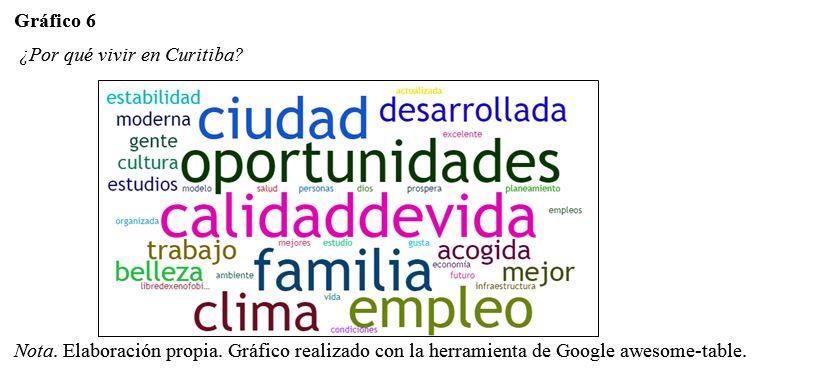 Para las personas encuestadas, la ciudad de Curitiba representa un polo de oportunidades, en las respuestas destaca la calidad de vida como condición fundamental para establecerse como destino migratorio. Además de ello, resaltan las palabras clima, familia y empleo como complementos de la decisión de vivir en este espacio.