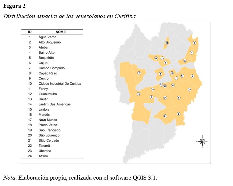 En primera instancia se les preguntó a los encuestados ¿en cuál barrio de la ciudad viven?, de las 73 personas 12,3% (9 personas) viven en el barrio Cajuru, 6,8% (5 venezolanos) en Fanny, Lindóia, Barrio Alto, Centro, Alto de Boqueirão y Agua Verde, respectivamente. En la figura 2, se muestra cartográficamente la distribución de venezolanos en la ciudad de Curitiba.