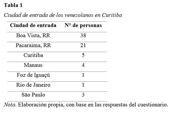 En esta sección se pretende identificar las maneras de ingreso de los venezolanos a Brasil y su forma de llegada a la ciudad de Curitiba. Con respecto a la forma de entrada y la ciudad se obtuvo que: 60 venezolanos entraron al territorio brasileño por accesos terrestres, 1 de los cuales lo hizo caminando a través de la frontera norte en el Estado de Roraima y 13 personas dijeron haber ingresado de forma aérea. La siguiente tabla muestra el número de personas y las ciudades de entrada al país.