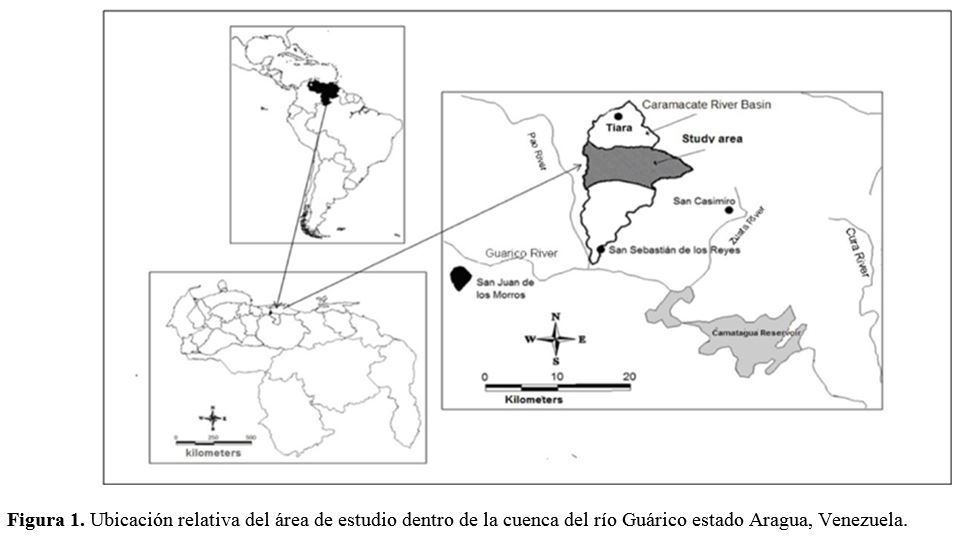 La investigación se realizó en un sector de la cuenca alta del río Guárico, específicamente en la cuenca del río Caramacate. Está ubicada entre los municipios Santos Michelena y San Sebastián de los Reyes, estado Aragua (Venezuela), entre las coordenadas geográficas 9,55 a 10,09° Norte y -67,12 a -67,03° Oeste (Figura 1). La cuenca del río Caramacate representa el 8,5% de la cuenca alta del río Guárico, de la cual es tributaria. Para el ensayo de agrupamiento de los suelos se seleccionó un área muestra de 6760 ha, donde el paisaje está dominado por laderas de montaña con pendientes del 40%. La geología está representada por rocas metavolcánicas y basaltos de la formación El Caño-El Chino, y por metalavas máficas de la formación El Carmen (Pineda et al., 2011a). La zona presenta una altitud comprendida entre 334 a 1405 msnm., con una precipitación media anual que oscila entre 1100 y 1400 mm y la temperatura media anual varía entre 22 y 26 ºC. La vegetación herbácea ocupa más del 50% del sector, como producto del uso ganadero en condiciones extensivas, acompañada de sobrepastoreo y quemas anuales de vegetación. Los suelos en su mayoría son Entisoles, Inceptisoles y Alfisoles, cuya variabilidad se ha incrementado por el uso de la tierra basado en ganadería extensiva y la incidencia de movimientos en masa (Pineda et al., 2011b). Esta situación ha llevado a que la cuenca esté sometida a intensos procesos de degradación, por lo que es necesaria la organización de la información de suelos para apoyar la implantación de planes de manejo.