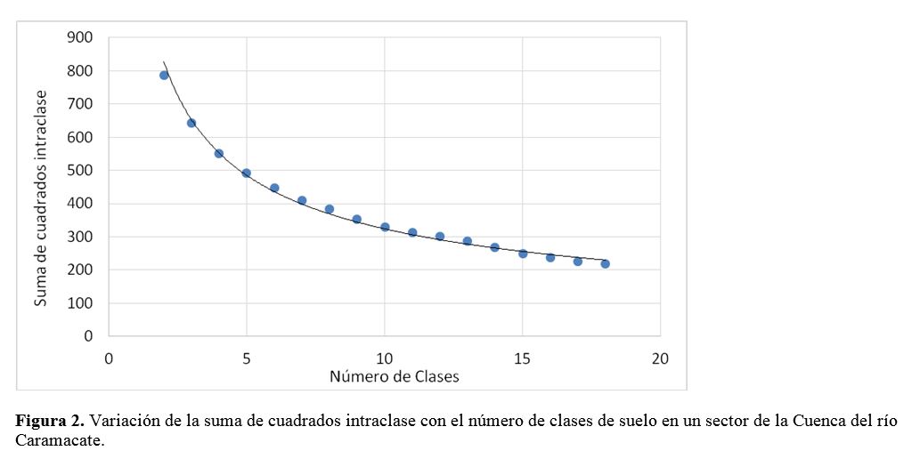 Se calculó la suma de cuadrados intraclase de cada agrupamiento y se dibujó un diagrama de dispersión para observar la variación de la suma de cuadrados con relación al número de clases. Este diagrama (Figura 2) revela que la suma de cuadrados intraclase disminuye y, por ende, la homogeneidad interna de las clases aumenta a medida que crece el número de clases. El diagrama de dispersión también revela que la suma de cuadrados tiende a hacerse asintótica a partir de diez (10) clases. En consecuencia, se utilizaron diez unidades de salida de la red SOM, lo cual corresponde a un mapa bidimensional de 2 x 5 neuronas. Este número de clases es parecido al utilizado por Ferrer et al. (2018), quienes agruparon los perfiles de suelo del área de estudio en once (11) clases, por medio del algoritmo fuzzy c-means.