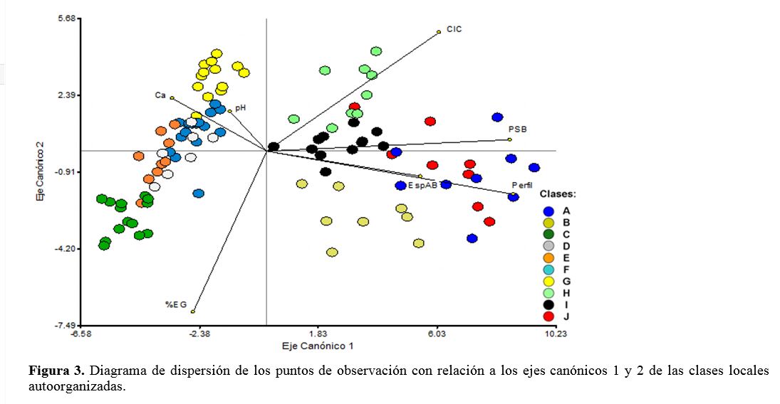 El diagrama de dispersión de los puntos de observación representados en la Figura 3 indica que las clases H e I se distribuyen en el primer cuadrante, en el que el PSB y la CIC tienen coeficientes de moderada a alta magnitud en el eje canónico 1. Las clases A, B y J ocupan el segundo cuadrante del diagrama; las dos primeras se identifican con suelos de horizonte A superior a 25 cm, con un gran espesor del solum y la mayor profundidad efectiva, lo que está relacionado con un mayor grado de desarrollo de los suelos.