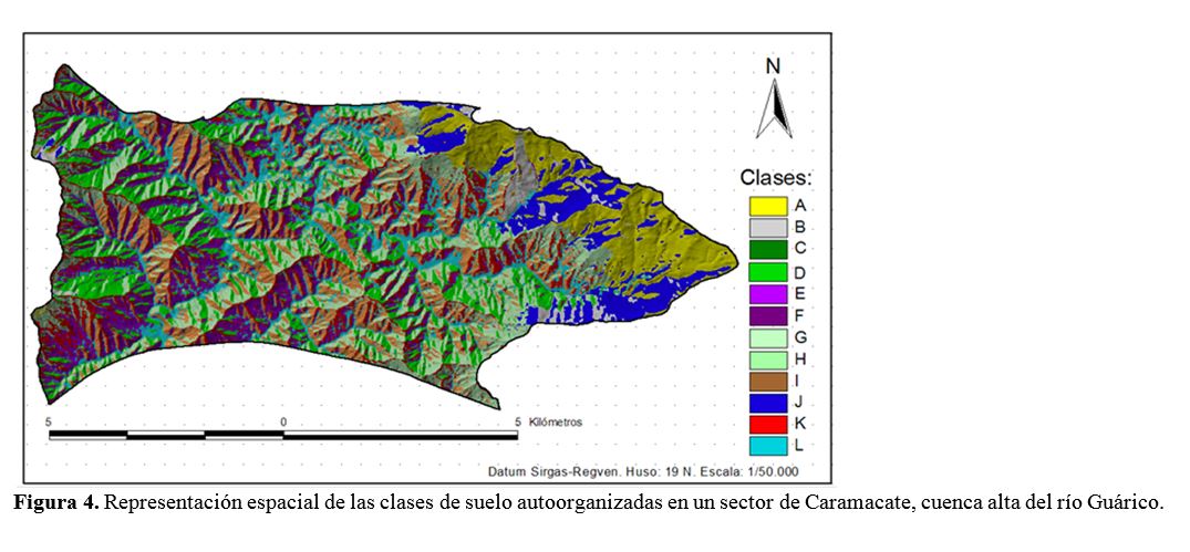 Los resultados de la aplicación del estadístico c. (238,1) y el CC (0,798), indican que existe una relación entre las clases de suelo con las unidades geomorfológicas derivadas del análisis morfométrico del terreno en investigaciones previas (Viloria et al., 2016). Es evidente la asociación entre clases, ya que los valores del CC son equivalentes al 80%, lo cual tiene una significación asociada a un estadístico c. menor a 0,05 (0,000). Estos resultados permiten rechazar la hipótesis de independencia entre las clases de suelo neuronales y las geoformas, y admitir que ambos grupos están ampliamente relacionados, lo cual facilitó las posibilidades de predicción y representación cartográfica de dichas clases. Debido a la asociación entre clases y a las relaciones suelo-paisaje, se realizó la correlación entre los suelos de ladera y las unidades geomorfométricas. La representación cartográfica de la variación de las clases de suelo autoorganizadas se presenta en la Figura 4, donde además de las clases de suelos de ladera se incluyen dos clases adicionales que representan las geoformas compuestas por las crestas y vigas de montaña (clase K) y las vegas de los valles intramontanos (clase L) (Valera, 2015).