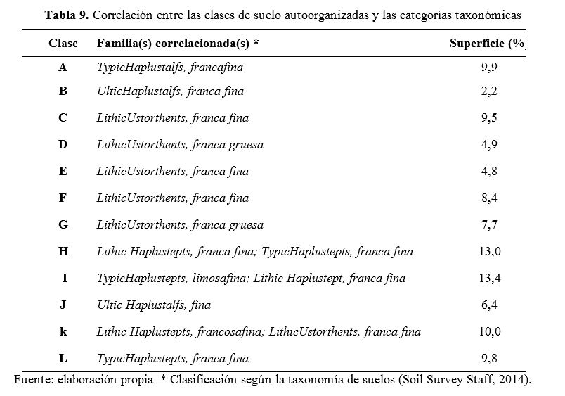 Estas últimas unidades de paisaje se caracterizan por presentar condiciones de mayor homogeneidad edáfica, razón por la cual no se incluyeron en la evaluación del presente estudio. La representación geoespacial de las clases de suelo, obtenidas con el método de agrupamiento neuronal, deja en evidencia la influencia aportada por la discretización de las unidades espaciales mínimas (celdas), cuya expresión geográfica está dada por los límites de las clases morfométricas del terreno, utilizadas como base para la representación espacial de las clases de suelo. Bajo este enfoque, la estructura de variación de las clases de suelo neuronales facilitó la comprensión de las relaciones suelo-paisaje en la zona de estudio, y posibilitó la correlación con las categorías taxonómicas a nivel de familia de clases de tamaño de partícula (Soil Survey Staff, 2014), tal como se indica en la Tabla 9.