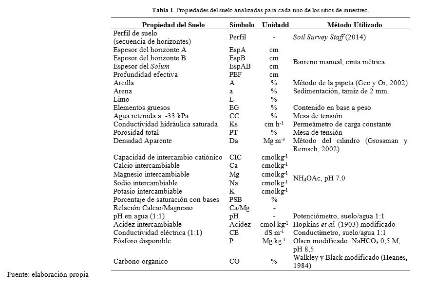 El conjunto de datos derivados de cada sitio de muestreo incluyen 25 propiedades edafológicas: i) variables físicas relacionadas con la granulometría (contenido de arena, limo, arcilla, esqueleto grueso), con la retención de humedad (agua retenida a capacidad de campo) e índices estructurales (conductividad hidráulica, densidad aparente, porosidad total); ii) variables químicas relacionadas con la disponibilidad y retención de nutrientes (capacidad de intercambio catiónico, Calcio, Magnesio, Potasio y Sodio intercambiables, relación Ca/Mg, porcentaje de saturación con bases, reacción del suelo, acidez intercambiable, fósforo disponible, carbono orgánico, conductividad eléctrica); iii) variables morfológicas relacionadas con la profundidad del suelo (espesor del horizonte A, secuencia de horizontes en el perfil, espesor del solum, espesor del horizonte B, profundidad efectiva del suelo) (Valera, 2015). En la Tabla 1, se señalan las propiedades consideradas y las metodologías empleadas en la determinación analítica de los suelos.