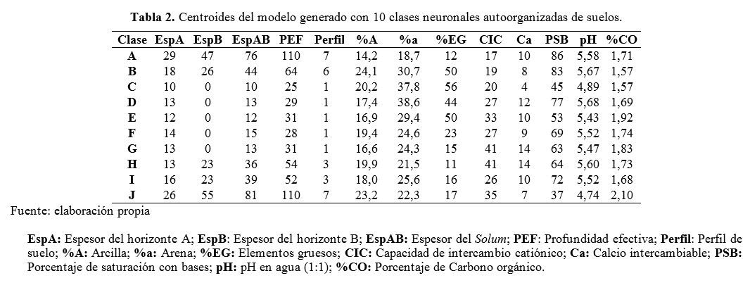 De la Tabla 2 mencionada se pueden deducir tres grandes categorías con base en los atributos morfológicos: i) clases de suelos muy profundos a profundos (A, B, J), ii) clases de suelos moderadamente profundos (H, I) y iii) clases de suelos superficiales (C, D, E, F, G). Todas las clases presentan diferencias entre sí, cuyos contrastes se complementan con el aporte de los centros de los atributos físicos y químicos. Los atributos físicos separan claramente las clases (C, D, E) de la clase G, la cual presenta el valor más bajo de %EG. La influencia de los atributos químicos permite contrastar las clases C y G por la influencia de la CIC, el pH y el PSB admite la diferenciación entre las clases A y J, y permite contrastar las diferencias entre A, C y J por la influencia del PSB y el %CO. Los resultados indican que en todas las clases obtenidas, se mantiene la estructura topológica de los datos de entrada a la red neuronal (Baçao et al., 2005).