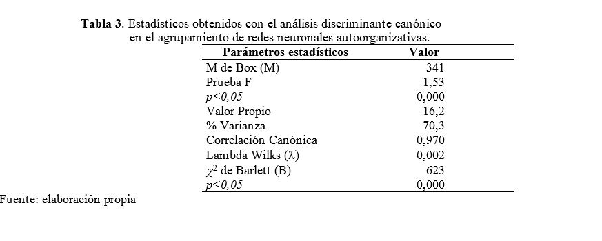 Los SOM han demostrado su eficacia en algunos problemas reales en los que incluyen tareas de clasificación, reducción de dimensiones y extracción de rasgos. Su utilidad más importante se relaciona con la clasificación de información o el agrupamiento de patrones por tipos o clases. En la presente investigación se empleó el programa NeuroXL® versión 4.0.6 (Neuro XL Clusterizer) (OLSOFT, 2016), el cual se integró en Microsoft Excel®. El clasificador NeuroXL® utiliza un algoritmo de autoorganización integrado en hojas de cálculo. El programa funciona con varios parámetros de entrenamiento que gobiernan el proceso de operación de la clasificación, donde destacan los siguientes: i) número de clases; ii) tasa de aprendizaje, corresponde a un valor entre 0 y 1 que afecta el ritmo al cual la RNA inicia el aprendizaje; iii) ciclos, referidos al número de pasos completos de la RNA través del conjunto total de datos; iv) peso inicial de la sinapsis, valor con el que son inicializados los pesos sinápticos de cada neurona; v) función de activación, incluye cuatro (4) funciones alternativas: umbral, tangente hiperbólica (sigmoidal bipolar), sigmoidal logística con base cero, y sigmoidal logarítmica; vi) algoritmo de combinación convexa, utilizado para el entrenamiento de la red; vii) relación de aprendizaje, es el número de neuronas que afectará el aprendizaje durante la etapa de entrenamiento, el cual decrece a cero al finalizar el proceso de clasificación; y viii) valor de escala, esta opción permite escalar los valores de entrada en rangos dependientes de la función de activación empleada (e.g. 0-1, -1-1). En esta investigación, el entrenamiento de la red neuronal se realizó con una tasa inicial de aprendizaje de 0,5; 1.000 iteraciones, un peso inicial de 0,3 con una relación de aprendizaje de 3 neuronas por ciclo. La función de activación empleada fue la tangente hiperbólica o sigmoidal bipolar. Las funciones sigmoidales bipolares de tipo tangente hiperbólica son ampliamente utilizadas en tareas de clasificación de patrones (Quintín y Paz, 2007). Esta función tiene una variación de -1 a 1, y es probablemente la función de activación más empleada en la actualidad.