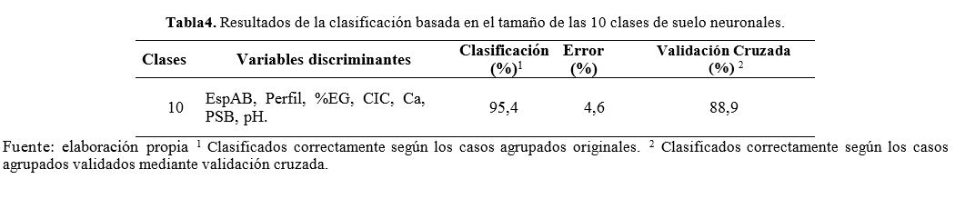 Las primeras correlaciones canónicas del agrupamiento SOM presentan autovalores de 16,2 para las primeras funciones discriminantes canónicas, indicando que las variaciones entre las clases de suelo son dieciséis veces mayores que las variaciones internas de dichas clases. Es decir, la variabilidad entre las clases es superior a la variabilidad dentro de las clases. En cuanto a la valoración de la capacidad predictiva de las funciones discriminantes (EspAB, Perfil, %EG, CIC, Ca, PSB, pH), los resultados de la clasificación realizada indicaron que el 95,4% fue clasificado correctamente según los casos agrupados originales (Tabla 4). Además, el 88,9% fue clasificado correctamente según los casos agrupados corroborados mediante validación cruzada y solamente se encontró un 4,6% de error. La distancia de Mahalanobis (D.), basada en las funciones canónicas para los datos originales, arrojó valores superiores al 95% con bajos errores. La D. , basada en las observaciones para los datos validados mediante validación cruzada, reflejó resultados menores que las clasificaciones originales, cercanos al 89% para los perfiles de suelo.