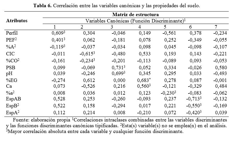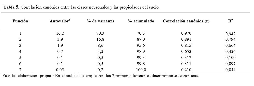 En la Tabla 5 se indica que la primera correlación canónica es alta (r = 0,97), al igual que las dos siguientes, cuyo conjunto explica el 96% de la interrelación entre las propiedades del suelo y las clases de suelo autoorganizadas. Las últimas tres correlaciones restantes son bajas y solamente explican menos del 3% de la variabilidad presente entre las variables edáficas y las clases de suelo. El valor propio de la primera correlación es de 16,2 lo cual indicó que la variación entre las clases es dieciséis veces mayor que la variación interna de dichas clases.