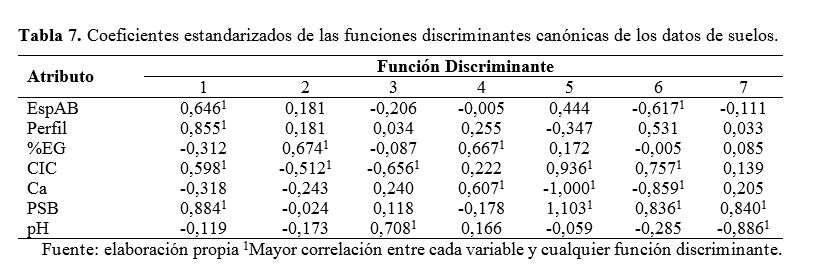 La segunda función discriminante está negativamente correlacionada con la CIC, y latercera correlación canónica con el PSB y pH. Solamente siete atributos contribuyen a la discriminación entre las clases de suelo, los cuales están relacionados con el espesor del solum, secuencia de horizontes, contenido de esqueleto grueso, cationes intercambiables, reacción del suelo, granulometría y pH, tal como se señala en la Tabla 7.