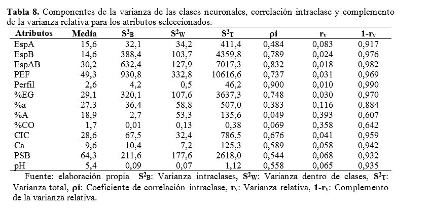 El análisis de varianza para la clasificación de una vía permitió la obtención del coeficiente de correlación intraclase (ri) de los atributos del suelo por efecto de las clases neuronales, así como también el complemento de la varianza relativa, los cuales se observan en la Tabla 8. Los resultados indican que en las situaciones descritas la varianza intraclases promedio presenta valores menores que la varianza total (Webster y Oliver, 1990), lo cual es un indicativo de que las clasificaciones realizadas son altamente meritorias para las variables consideradas.