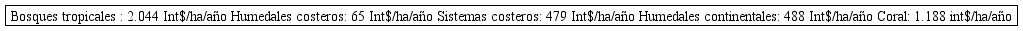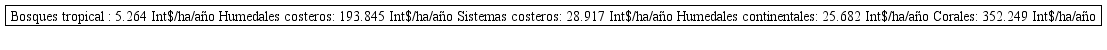 Ha habido un aumento exponencial de los estudios básicos y aplicados sobre la valoración de la biodiversidad y los ecosistemas, desde finales del siglo XX, en las publicaciones de amplio reconocimiento técnico-científico mundial (TEBB, 2010, de Grott et al., Kadykalo et al., 2019). Se han valorado los servicios ecosistémicos de 5 biomas de relevancia para la Región: Bosques Tropicales, Humedales Costeros, Sistemas Costeros, Humedales Continentales, Corales. En el cuadro a continuación se muestra el valor expresado en Int$ [2] por hectárea/año de los servicios ecosistémicos de interés para la vida humana en estos biomas: