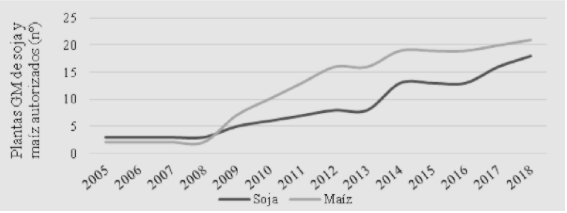El incremento del área sembrada con cultivos GM en Uruguay fue alentado por el constante aumento del número de autorizaciones de nuevas plantas de soja y maíz. En total, las aprobaciones aumentaron 680 %, pasando de 5 en el año 2008 a 34 en el año 2018. De esos 34 nuevos eventos, 18 son de soja y 21 de maíz (Figura 1). Incluyen eventos de uso comercial, así como para semillas de exportación, investigación y para evaluación de cultivares experimentales. Entre las características de estas plantas GM destaca la resistencia a herbicidas, siendo la resistencia al glifosato y glufosinato-amonio la gran mayoría (77 %). Cabe resaltar, además, que actualmente se encuentran en evaluación 8 nuevas variedades de soja, 4 de maíz y uno de trigo. Por lo cual es de esperar que, en los próximos años, el número de eventos autorizados continúe su tendencia ascendente.