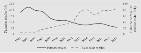 A ese escenario se le suma que la investigación nacional no se traduce en patentes. Así, las patentes registradas por el país, según la Oficina de Patentes Europea, tienen una tendencia decreciente, disminuyendo 69 % en el período (Figura 2). Como resultado, el monto que se paga por utilizar patentes extranjeras es muy superior al monto que se recibe por el uso en el exterior de las patentes uruguayas. Así, el balance de regalías es netamente creciente, aumentando 92 % entre los años 2005 y 2018. De acuerdo a CEPAL-SEGIB (2008) esto denota una eficiencia limitada en materia de generación y adopción de nuevas tecnologías.