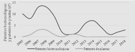 Cuando se analiza las patentes del área biotecnológica se observa que también presentan una tendencia decreciente, alcanzando su valor máximo (13) en el año 2008 y el mínimo (1) en los años 2011 y 2016 (Figura 3). En todo el período analizado las patentes totales son 1691, y las biotecnológicas 80, lo cual representa un 4.7 % del total. En particular, las correspondientes a plantas o procesos para obtenerlas representan una pequeña fracción de las anteriores y son inexistentes a partir del año 2013. Sin embargo, este rubro de patentes es uno de los más redituables globalmente. Consecuentemente, Uruguay queda excluido de un mercado que produce ganancias cuantiosas por concepto de regalías, al jugar un simple papel de consumidor.