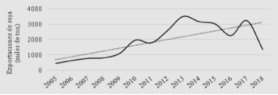 A diferencia del maíz cuya producción se dedica mayoritariamente al consumo interno, el grano de soja se exporta casi el 100 %. Estas exportaciones crecieron 203 % entre 2005 y 2018, alcanzando su máximo valor en el año 2013 (Figura 4). Las variaciones anuales obedecen no solo a variaciones del área sembrada sino también a las fluctuaciones del rendimiento del cultivo, las cuales están asociadas a cambios climáticos, sobre todo al efecto sobre las precipitaciones que tiene el fenómeno El Niño-Oscilación del Sur en esta región del Atlántico.