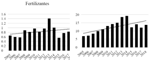 Paralelamente al incremento de las exportaciones se produce un aumento del consumo de agroquímicos, como fertilizantes y herbicidas, como lo evidencia sus importaciones en miles de ton. Los herbicidas son los de mayor crecimiento. Así, mientras el consumo de fertilizantes se multiplicó por 1.5 y el consumo de herbicidas lo hizo por 2.0 entre los años 2005 y 2018 (Figura 5). A pesar de este importante uso de agroquímicos, a excepción de la obligatoriedad de los importadores de registrarse para poder ingresar los productos al país, no existe control sobre las cantidades que usan los productores rurales. No hay información por productor ni por cultivo. O sea, se desconoce las dosis utilizadas, solo se registran los montos y los volúmenes importados de los diferentes químicos. En consecuencia, el uso se estima en función de sus importaciones, suponiendo que si se compra en algún momento se usa.
