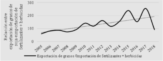 Por otro lado, si se compara el volumen de granos exportados con el volumen de fertilizantes y herbicidas importados se observa que esa relación es creciente, a pesar de la caída del año 2018, producto de la baja de las exportaciones. O sea, las toneladas de granos exportadas fueron, promedialmente, 130 veces más que las toneladas importadas de estos agroquímicos (Figura 6). La relación es tan grande que aunque se tomara en cuenta el volumen exportado por otros cultivos, nunca se obtendría valores negativos. Téngase en cuenta que la soja es el principal cultivo del país y que a excepción del maíz, los restantes no son GM por lo cual no presentan resistencia a herbicidas. Esto determina que su consumo sea menor. Este resultado evidencia el intercambio ecológico desigual planteado por Samaniego et al., (2017).