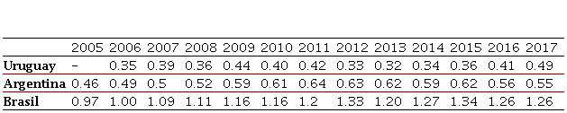 En primer lugar se presenta el número acumulado de plantas de GM de soja y maíz autorizadas en Uruguay. Los datos fueron obtenidos en el Gabinete Nacional de Bioseguridad (GNBio) (http://www.sistemanacionaldebioseguridad.gub, visitado el 12/12/2018). Luego, el Gasto en I+D como porcentaje del PBI del Uruguay y la región. Los datos fueron recabados en la Red de Indicadores de Ciencia y Tecnología de Iberoamérica (RICYT) (http://www.ricyt.org/indicadores, visitado el 13/03/2019).