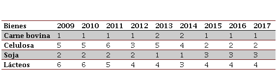 Cabe destacar la importancia de la soja como conductora de las exportaciones del país, existiendo una fuerte correlación entre el comportamiento de las exportaciones y las ventas de sus granos. En el año 2017, esos cuatro productos representaron el 70 % del total exportado. Según el Instituto Uruguay XXI (2018), las exportaciones uruguayas de bienes, incluyendo las realizadas desde zonas francas, tuvieron un incremento de 9.2 % respecto a 2016, siendo el mayor crecimiento desde el año 2011. O sea, la estructura exportadora uruguaya determina que el patrón de comercio exterior esté sustentado en productos primarios.