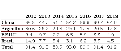 Desde al año 2012, China es el principal socio comercial de Uruguay. Así, en 2018, fue el destino del 26 % de las exportaciones nacionales de bienes, con un monto de US$ 2.328 millones. Le siguieron Unión Europea (18 %), Brasil (12 %), Estados Unidos (7 %), Argentina (5 %), y México (4 %) (Instituto Uruguay XXI, 2018). Sin embargo, de todos ellos solo China es comprador de granos de soja con alrededor del 80 % del total producido por Uruguay, alcanzando casi el 90 % en el año 2018 (Tabla III). Semejante concentración de destino sumado a la importancia de este grano en las exportaciones, expone al país a una situación de riesgo respecto a los vaivenes de la economía china.