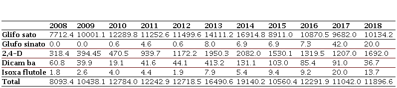 Dentro de la importación de herbicidas se destaca la correspondiente a glifosato, la cual se incrementó un 31.4 % en el período 2008-2018. Como resultado aumentó la resistencia de muchas herbáceas, por lo cual cada vez se recurre a la utilización de herbicidas de mayor poder de toxicidad como dicamba y 2,4-D. Así, las importaciones de estos agroquímicos, asociados a las nuevas plantas GM que se han autorizado en el país, se incrementaron 47 % y, por ejemplo, la importación de glufosinato de amonio, inexistente hasta el año 2010, se multiplicó por 20 en el año 2018 (Tabla V).